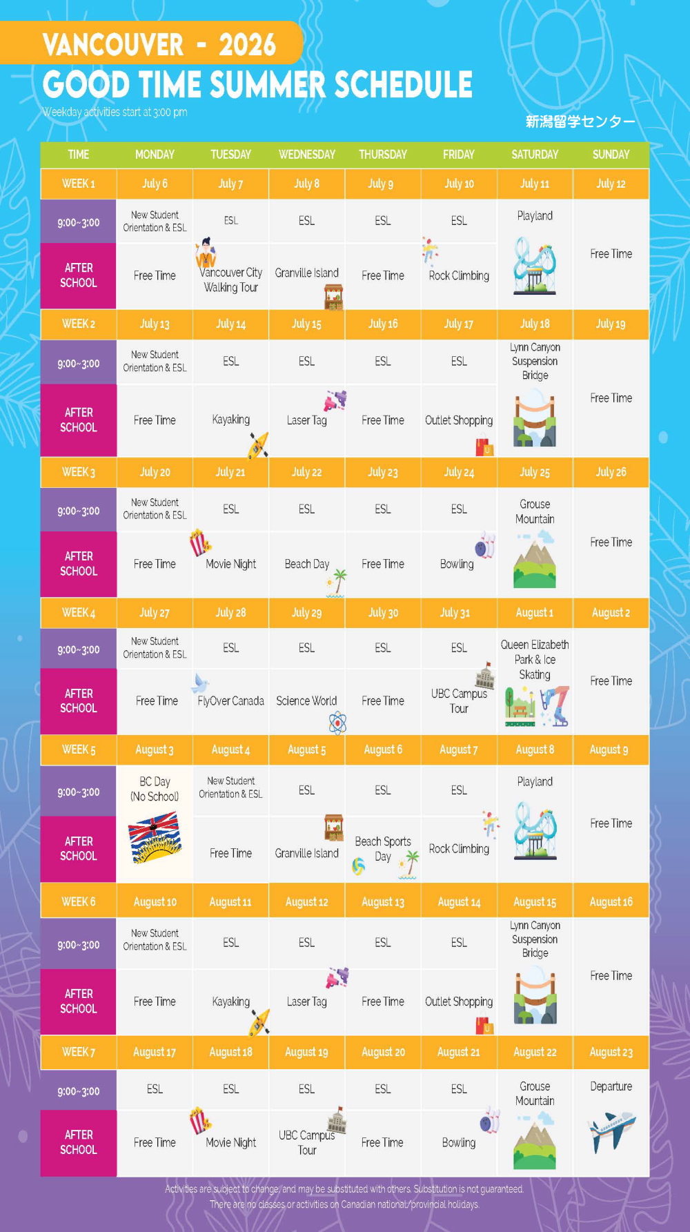 | ★アクティビティが開催されない日(自由行動)は、15:00~エクストラ・クラスで英語を学べます。 | |||||||||||||||||||||||||||||||||||||||||||||||||||||||||||||||||||||||||||||||||||||||||||||||||||||||||||||||||||||||||||||||||