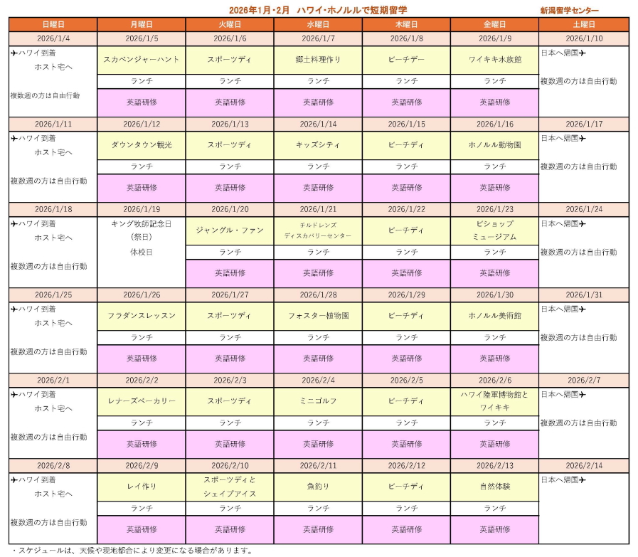 | 入学日 | 2026年 1月5日(月)、12日(月)、19日、26日 2月2日(月)、9日(月) ★ハワイ到着は前日の日曜日です。 |