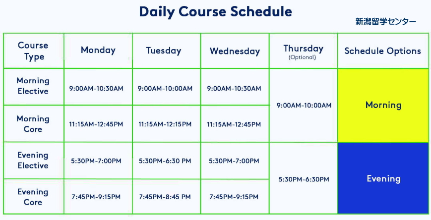 | 入学日 | 指定日(4週間間隔) ※新潟留学センターで申込は毎週月曜日可(一部除く) |