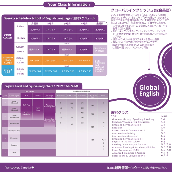 | アフタヌーンクラス | •Speaking and Error Correction Plus •Beginner Plus •Pronunciation Plus •Academic Preparation Plus •Multimedia Project Plus •Business English Certicate Program |