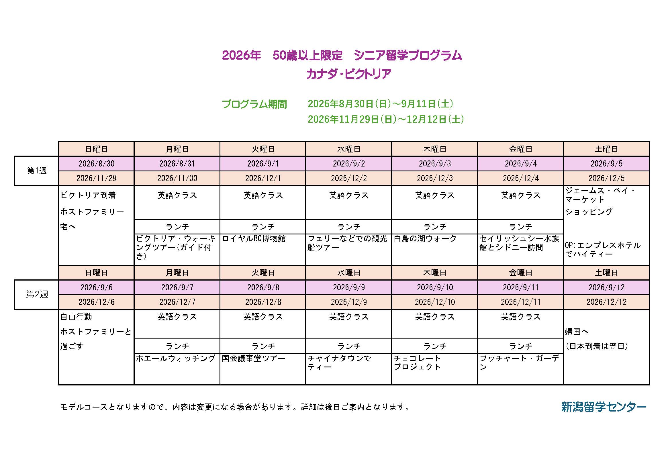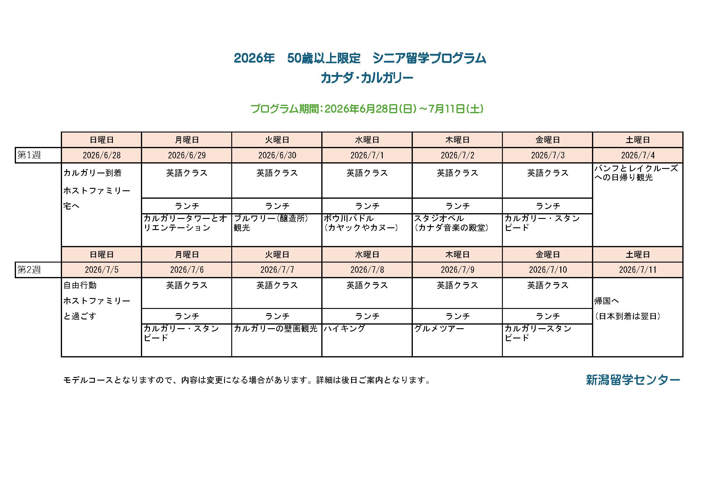 | シニア向けの「英語+アクティビティ」プログラムです。英語が苦手な方でも、少しの勇気を持ってご参加ください。現地では、プログラムに精通した優しいスタッフが、皆様のお世話やサポートをいたします。 カナダのビクトリアとカルガリーのベストシーズンに、期間限定で開催いたします。 このプログラムには、一般英語授業の他、午後や週末に開催される大人向けのさまざまなアクティビティ、社交イベント、健康活動、ツアーが含まれています。 |